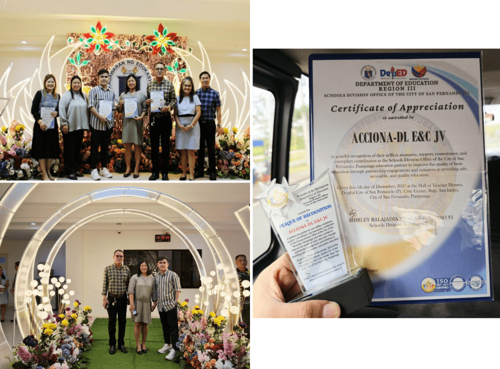 Acciona-DL E&C JV (ADJV) received a Certificate and Plaque of recognition during the 2025 Local Stakeholders' Convergence Cum Awarding Ceremony for Best Implementing Schools in Partnership and Linkages. ADJV is selected by San Pedro Integrated School, one of the Social Development Program beneficiaries in 2024 & 2025. This event was hosted by the Department of Education (DepEd) Schools Divisions of San Fernando, Pampanga to recognize schools and partners for strong collaborations and focus on community-rooted education and strengthening educational programs through joint efforts. This event highlighted the role of partnerships as a key component in academic achievement.